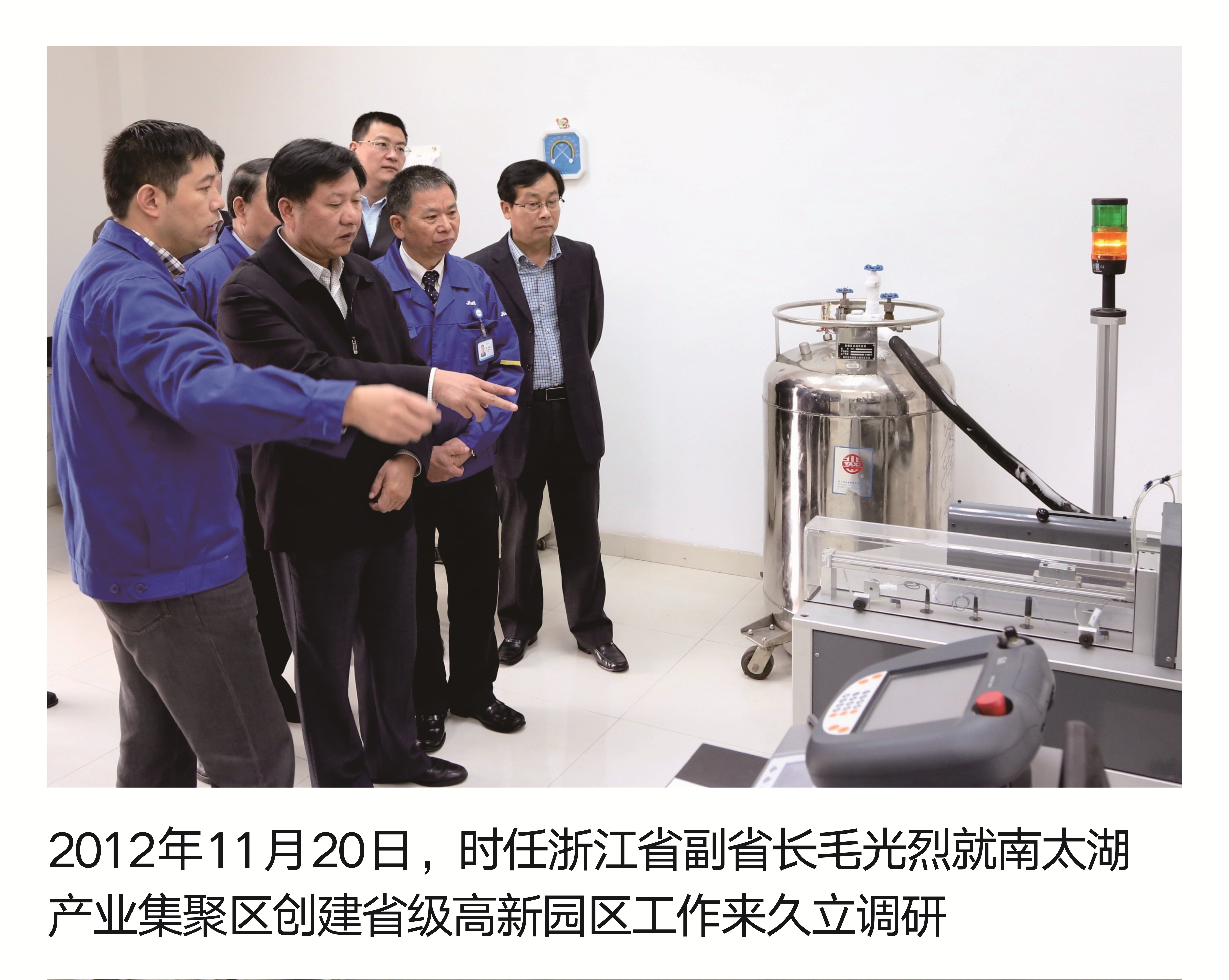 2012年11月20日,時任浙江省副省長毛光烈就南太湖產業集聚區創建省級高新園區工作來久立調研